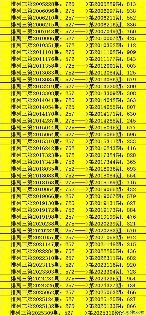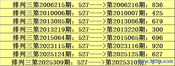 第2025309期摆列三奖号为527,历史上该号码组选开出46次,下期奖号永诀为:813、938、552、836、760、425、112、909、843、003、125、679、300、308、363、807、630、245、577、696、233、416、828、365、693、554、716、432、579、627、884、476、821、570、972、215、436、682、920、728、954、134、466、627、866。